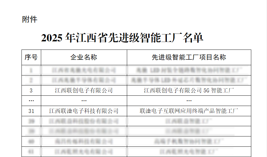 近日,江西省工业和信息化厅正式公布2025年江西省“先进级智能工厂”名单,186家企业入选。其中米兰(中国)体育官方网站-AC Milan,、江西联淦电子科技有限公司2家联创电子系企业名列榜单。这标志着公司在智能制造领域的创新成果再次获得政府权威认可。